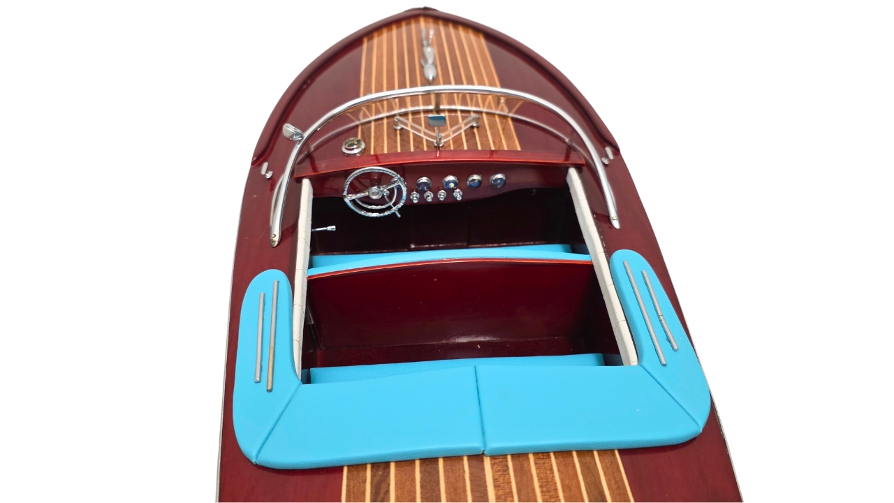 Model Riva Ariston o wymiarach 67,5 x 22 x 18 cm został stworzony z najwyższej jakości wyselekcjonowanych gatunków drewna, z zachowaniem najdrobniejszych detali oryginalnej jednostki. Charakterystyczne wykończenie kilkoma warstwami farby i lakieru nadaje mu ten sam efekt lustra, który był znakiem rozpoznawczym włoskich łodzi Riva. Ręcznie wykonane skórzane siedzenia, metalowe akcenty deski rozdzielczej oraz liczne detale z polerowanej stali i mosiądzu dodają autentyczności temu wyjątkowemu modelowi marynistycznemu.